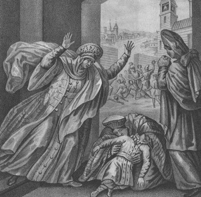 Григорий Федорович Нагой, брат царицы: «И прибежали на двор, ажно царевич Дмитрий лежит, набрушился сам ножем в падучей болезни».